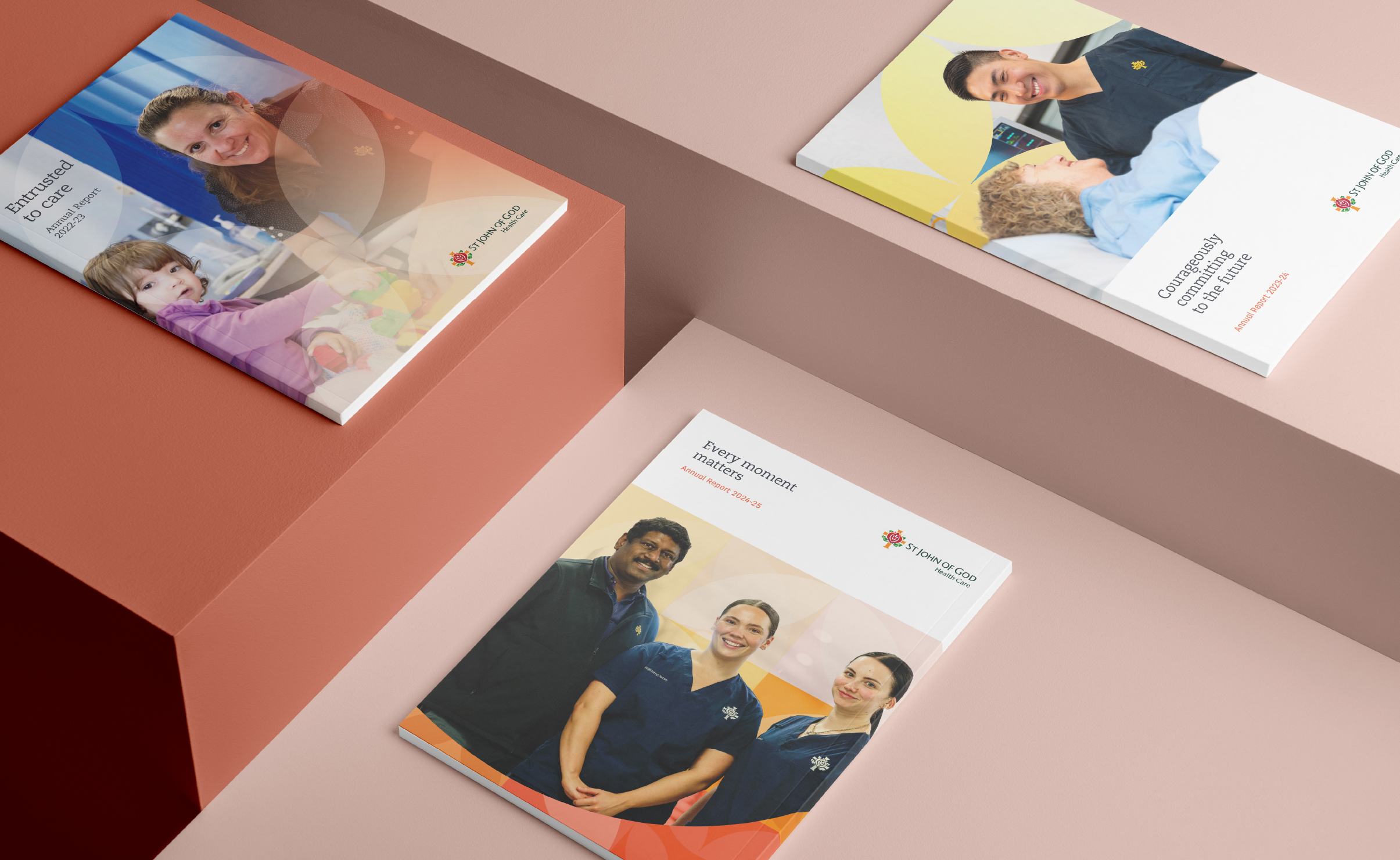 As a long-term partner, Clarity supports St John of God Health Care’s corporate reporting, delivering the design, layout and artwork for its annual reporting suite, including the Annual Report and Modern Slavery Statement. Working closely with internal stakeholders, we ensure complex governance, performance and compliance information is presented clearly, consistently and with care.